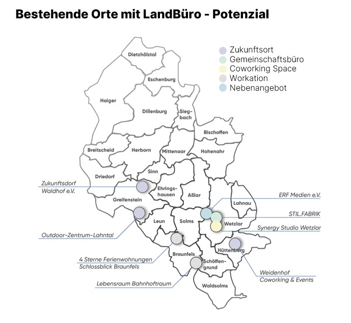 Ziel der Potenzialanalyse war es, fundierte Erkenntnisse darüber zu gewinnen, ob und in welcher Form die Einrichtung von Co-Working Spaces im ländlichen Raum im Lahn-Dill-Kreis sinnvoll und erfolgversprechend ist sowie unter welchen Bedingungen sie sich wirtschaftlich betreiben lassen. Auf Basis dieser Erkenntnisse können dann konkrete Empfehlungen für die Umsetzung eines solchen Projekts abgeleitet werden, um die bestmöglichen Voraussetzungen für eine erfolgreiche Etablierung und Nutzung von Co-Working Spaces im ländlichen Raum zu schaffen. Der Lahn-Dill-Kreis und die LEADER-Regionen Lahn-Dill-Wetzlar und Lahn-Dill-Bergland haben in einem gemeinsamen Kooperationsprojekt das Potenzial für neue Coworking Spaces auf dem Gebiet des Landkreises ermittelt.